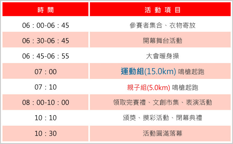 提醒所有參賽跑友,請依照自身當日身體狀況量力而為,並建議於活動前一日充分休息,當日於出發前兩小時進食早餐,以確保體能狀態良好。