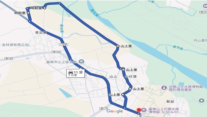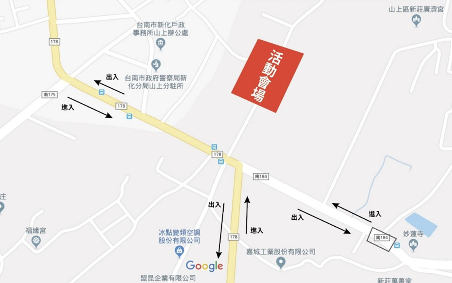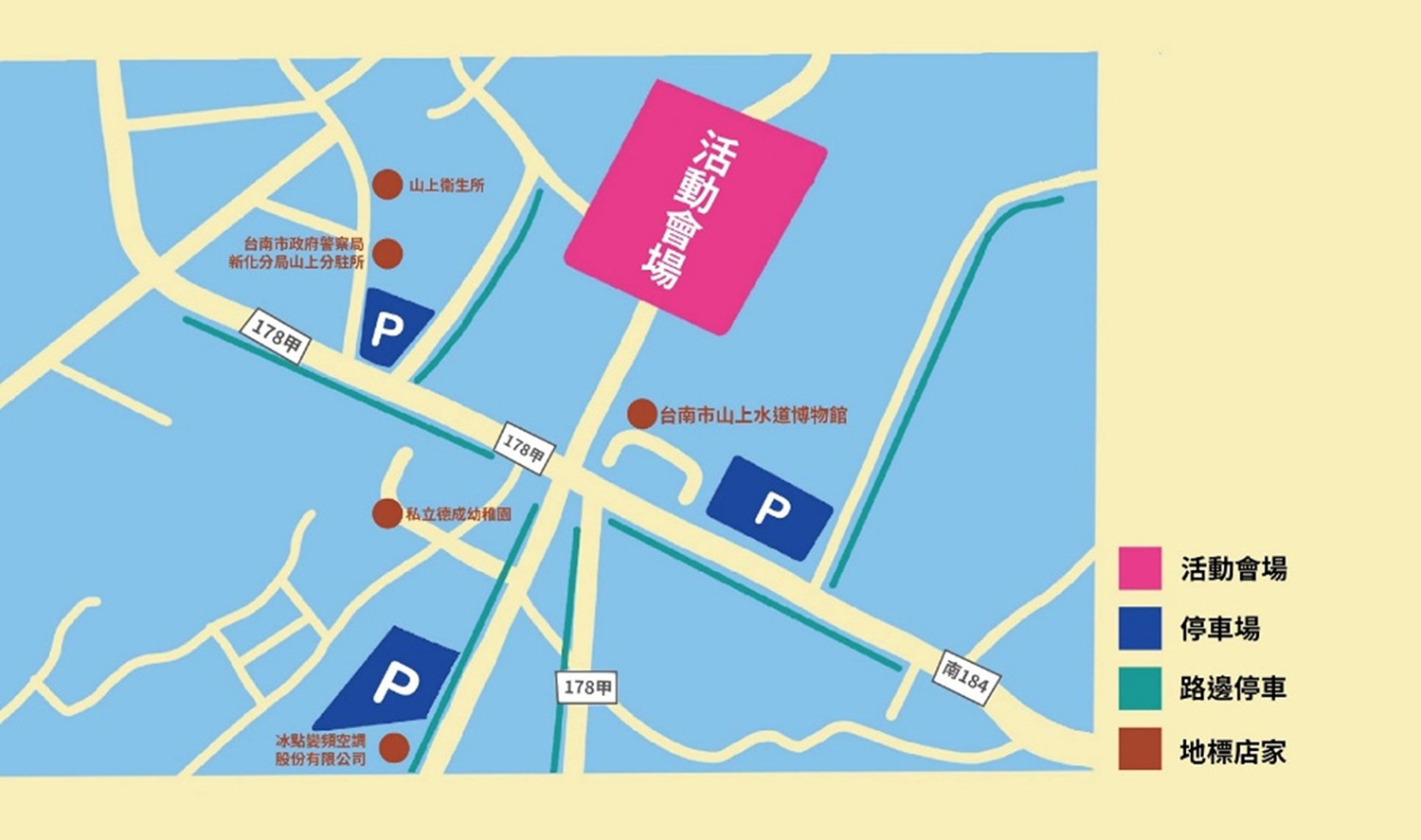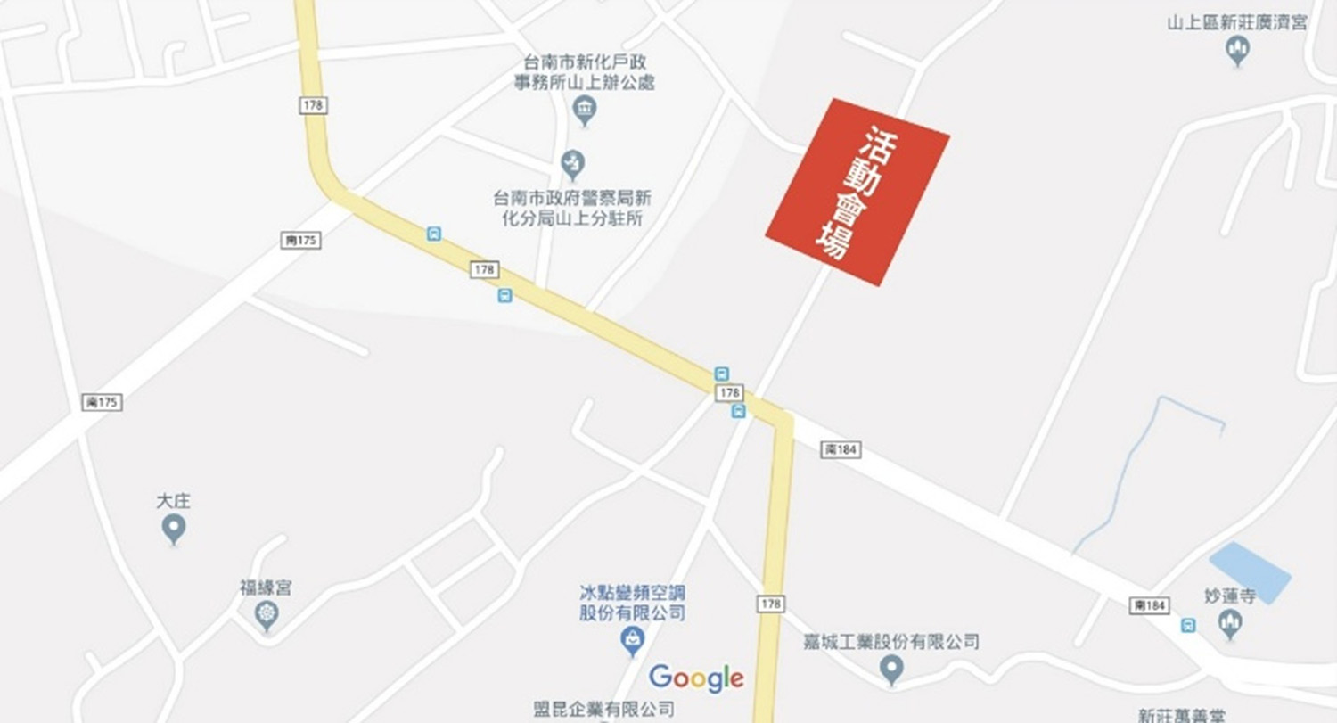 臺南山上花園水道博物館、臺南市山上區公所、臺南市山上區農會、臺南市山上區里長聯誼會、玉門關隆昭府、山上天后宮、亞太胡琴樂團、建豐精密工業(股)公司、山上工業區廠商聯誼會、世華安全衛生顧問管理有限公司、一億機器廠股份有限公司、善化新萬香餐廳、木瓜媽(南科山上總店)、臺南市山上區山上國民小學、臺南市大內區二溪國民小學、街役場文創有限公司、山上國正食堂、大內怡東農場、善化余記、大內黑殿Oden